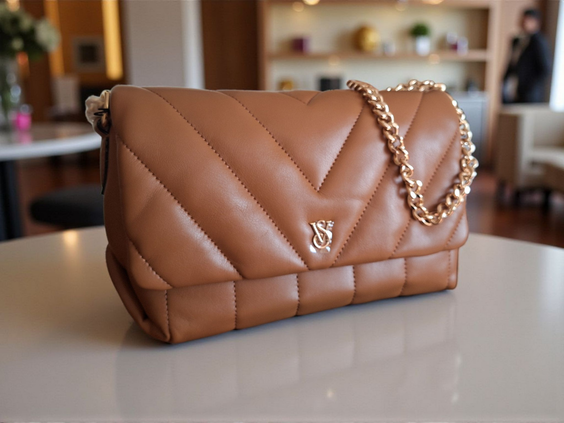 La cartera acolchada camel de Victoria’s Secret es ese accesorio versátil que eleva cualquier look desde un outfit casual hasta uno más elegante.
