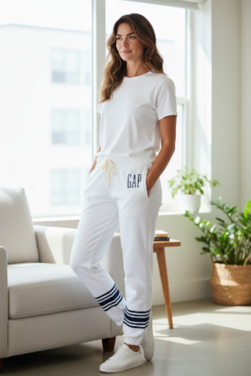 Este pantalón de buzo GAP blanco destaca por su diseño limpio y moderno, con detalle de franjas azul marino que le dan un toque deportivo y estiloso. Fabricado en material suave y resistente, ofrece comodidad durante todo el día gracias a su pretina elasticada y ajuste relajado. Ideal para usar en casa, para salir, entrenar o combinarlo con tus polerones favoritos.